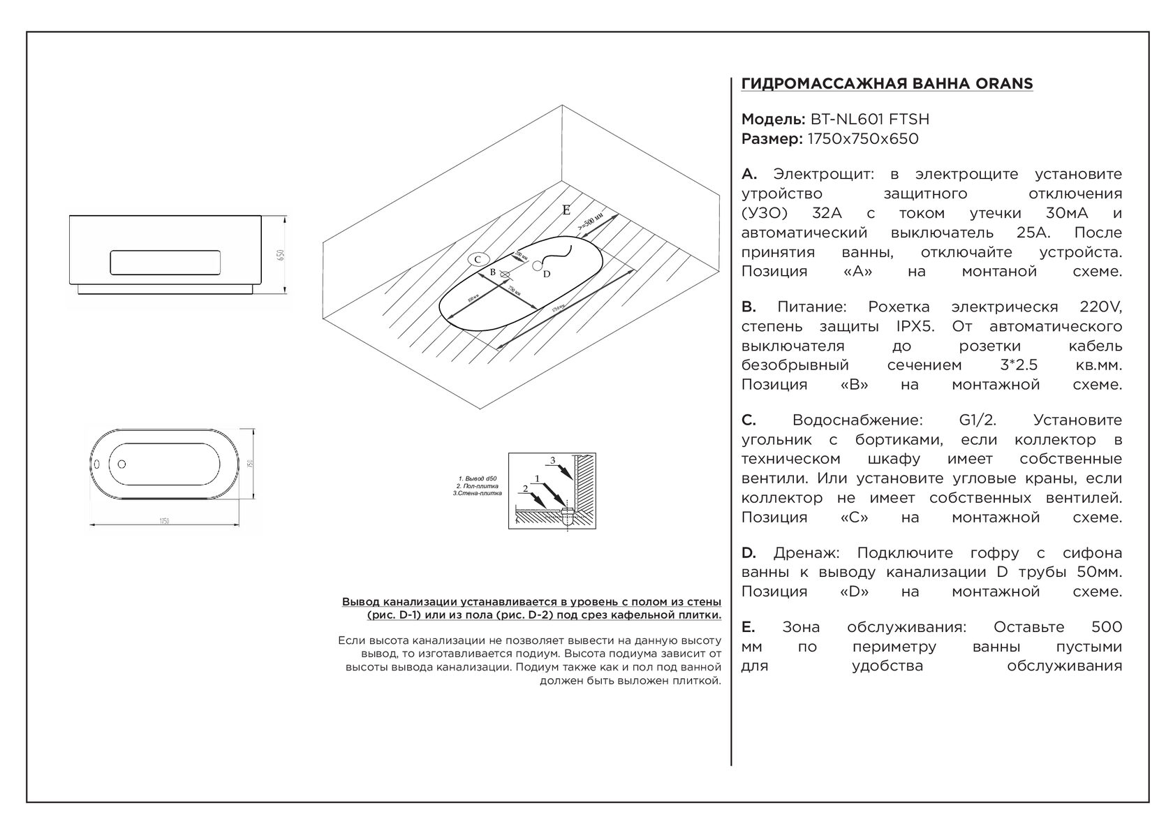 Современные материалы и технологии изготовления: 100% акрил английского производителя «Lucite International». Современная система аэромассажа – 26 форсунок, расположенных на дне ванны. Удобная кнопочная система управления. Система слив-перелив. Декоративная многоцветная подсветка (7цветов).Размер: 1750 х 750 х 650 мм