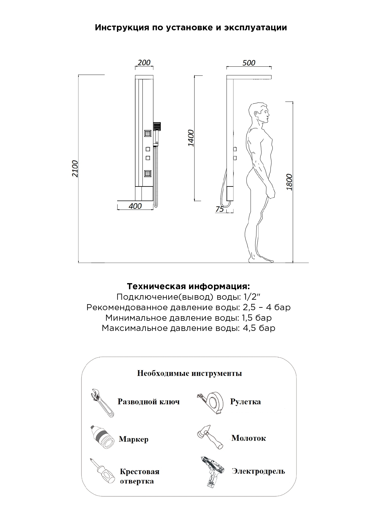 РАЗМЕР 1400 х 400 х 500 мм КОРПУС анодированный алюминий с порошковой окраской СМЕСИТЕЛЬ проргессивный КАРТРИДЖ керамический ТРОПИЧЕСКИЙ ДУШ с изливом «Водопад», 126х162мм РУЧНОЙ ДУШ ABS пластик, облегченный, 1 функция ПЕРЕКЛЮЧЕНИЕ ФУНКЦИЙ: ВЕРХНИЙ ДУШ + ИЗЛИВ "ВОДОПАД", РУЧНОЙ ДУШИ ФИКСИРОВАННЫЙ ИЗЛИВ позиционный переключатель ГИДРОМАССАЖНАЯ ПАНЕЛЬ / ФОРСУНКИ 3 шт. ИЗЛИВ - ПОКРЫТИЕ, НЕ ОСТАВЛЯЮЩЕЕ ОТПЕЧАТКОВ Anti‑fingerprint ГИБКАЯ ПОДВОДКА ВОДЫ 1 / 2’’, длина 600 мм. ГИБКИЙ ШЛАНГ 1500 мм ПОЛКИ 1 шт.Цвет: Белый, чёрный