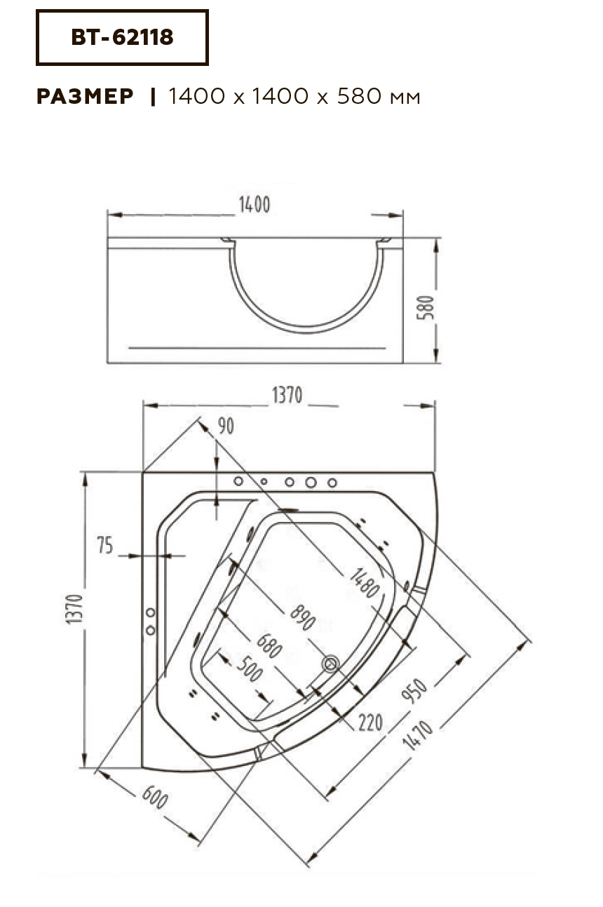 140 × 140 см (1,4 × 1,4 м), создана для тех, кто ценит гармонию элегантного дизайна и функциональности. Она идеально впишется как в просторные, так и в компактные ванные комнаты, превращая каждое купание в расслабляющий ритуал.