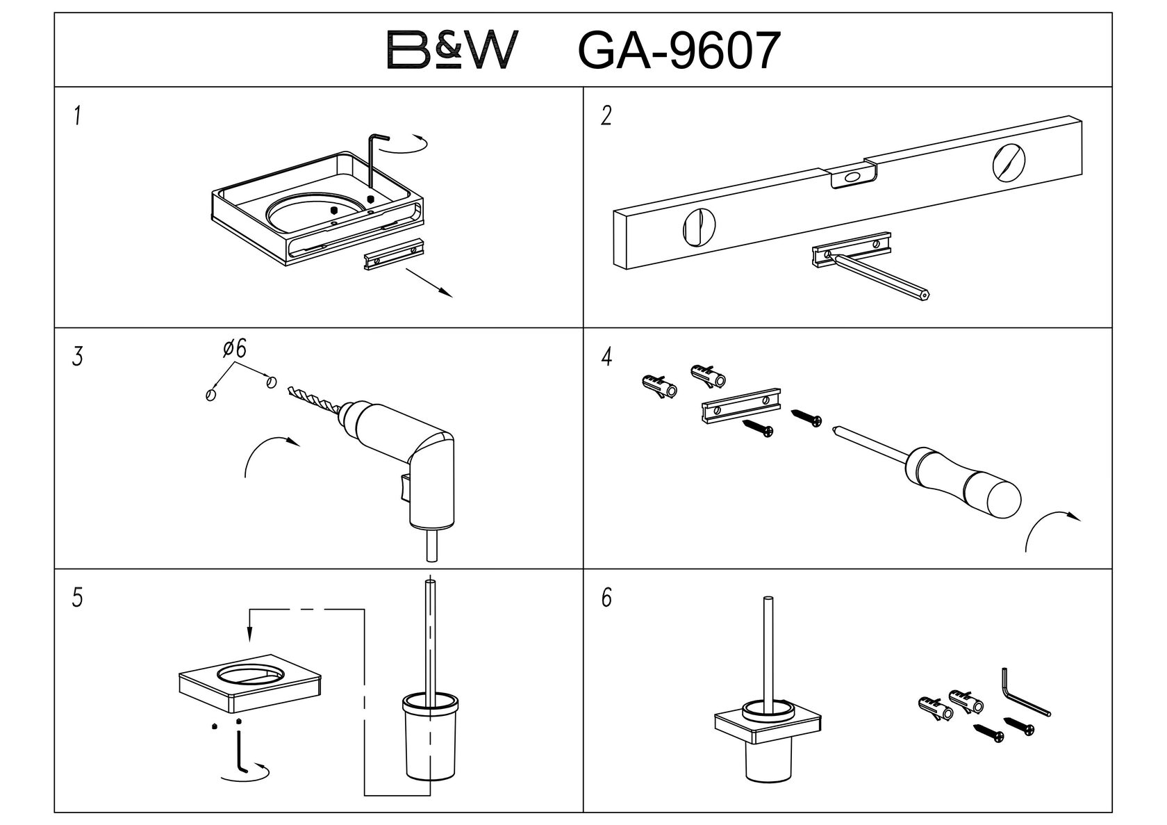 GA-9601 GM Крючок универсальный двойной; GA-9603 GM Полка и держатель для полотенца; GA-9605 GM Держатель для стакана; GA-9607 GM Держатель для ёршика; GA-9608 GM Держатель для полотенца; GA-9610 GM Полка, 30 см; GA-9615 GM Полка, 60 см; GA-9620 GM Полка и держатель для туалетной бумаги; GA-9622 GM Полка и двойной держатель для туалетной бумаги.Бренд: Black & White Дания
