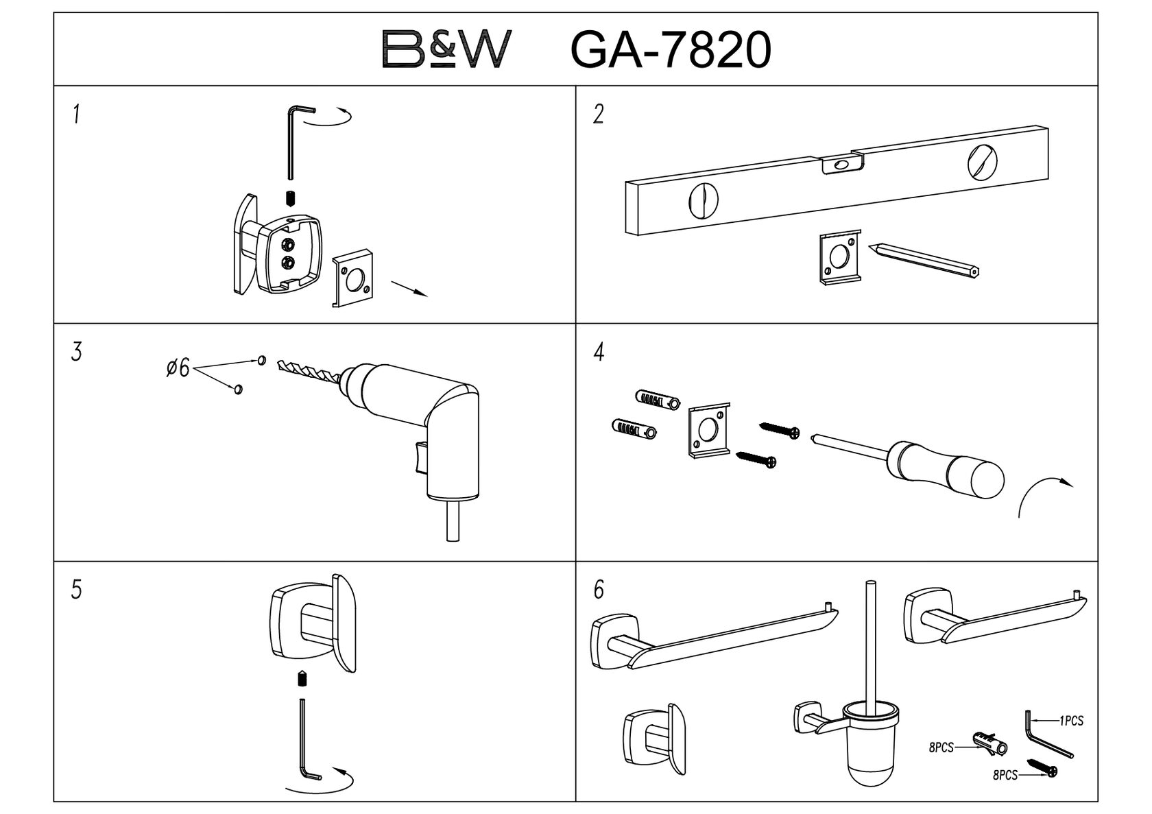Комплект аксессуаров GA-7820 GM GA-7301 GM Крючок универсальный GA-7302 GM Держатель для туалетной бумаги GA-7303 GM Держатель для полотенца GA-7307 GM Ершик для унитаза Комплект аксессуаров GA-7810 GM GA-7301 GM Крючок универсальный GA-7304 GM Мыльница GA-7305 GM Настенный стакан для зубных щеток GA-7309 GM Двойной держатель для полотенецБренд: Black & White Дания