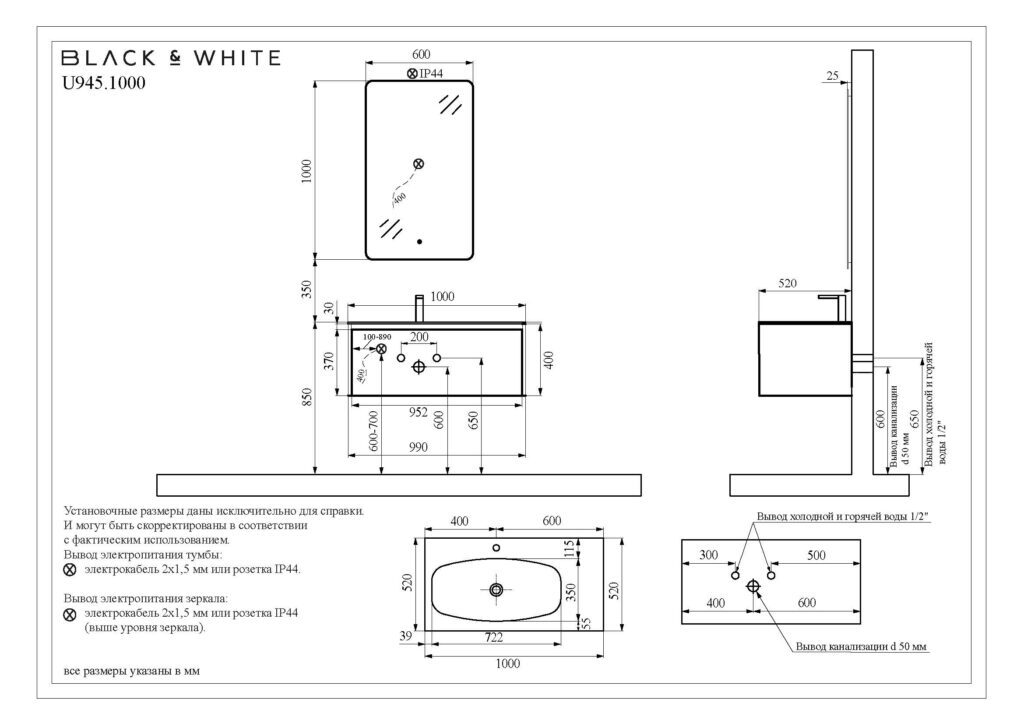 Инновационный комплект мебели датского производителя Black&White в габаритных размерах 100×52 см. Раковина – столешница асимметричной конфигурации с широкой чашей и расширенным местом для хранения ванных принадлежностей выполнена из непористого искусственного камня Corian и оснащена донным клапаном хромированного цвета.Тумба производится из девятислойной фанеры и окрашена влагостойкой эмалью глубокого синего цвета.Зона хранения оснащена одним выдвижным ящиком с высоким фасадом, механизм открывания – UniHopper с доводчиками.Важной особенностью является контурная диодная подсветка, которая расположена справа и слева от фасада, установленная на торцы корпуса.Она включается автоматически при приближении человека с расстояния 3-х метров и гаснет спустя 30 секунд после того, как Вы покинули помещение. U 945 – продукт разработанный датскими дизайнерами, в котором собраны все тенденции актуального мебелестроения для комфортного использования зоны умывания, а также наполнения ванной комнаты комфортом и уютом.