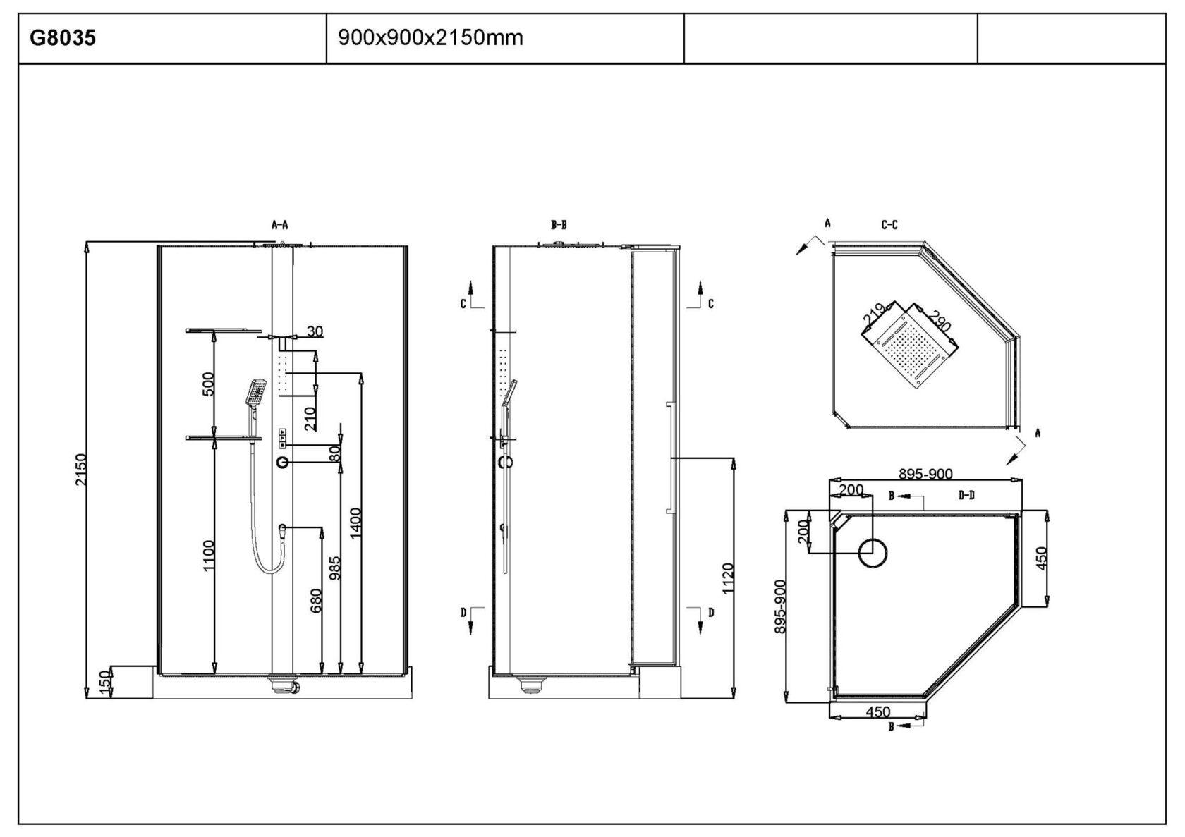 Свежее и компактное решение для душевой зоны – пятиугольные кабины. Бренд Black&White предлагает изделие G8035 в размере 90 X 90 см. Отличительной особенностью можно подметить индикатор температуры воды интегрированный в ручку смесителя. Подключение к электричеству не потребуется, на кабину установлена машина постоянного тока, которая работает от прохождения потока воды через потребители. Кнопочная панель выбора режимов, трехрежимная ручная лейка, вентиляционные отверстия в крыше, а также черно-белая комбинация элементов и форсунки гидромассажа подарят комфорт и наполнит ванную комнату стилем