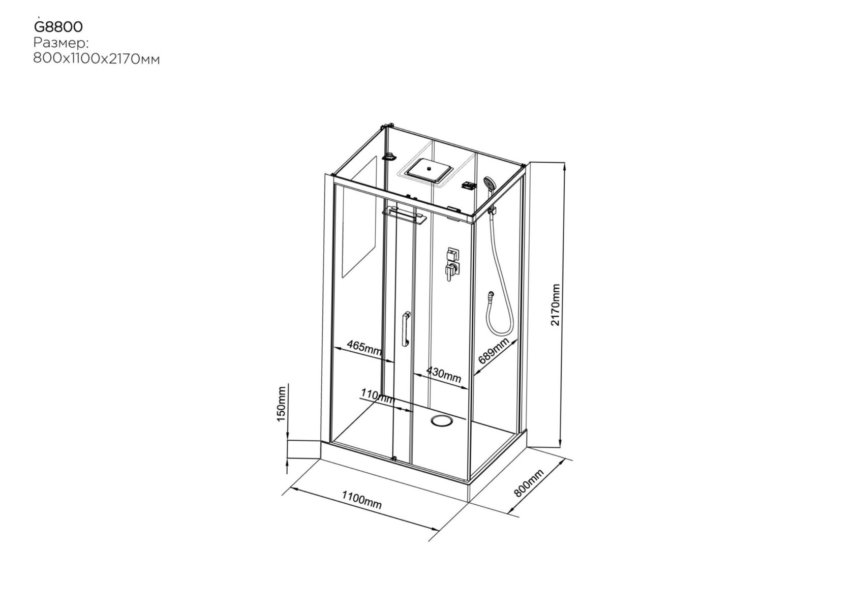Стекло нового поколения «Super White» - белое стекло высочайшего качества, с применением в качестве исходного материала стекла Optiwhite от Pikington (Англия). Левосторонняя или правосторонняя установка. Зеркало, интегрированное в стеклянную панель для удобства и комфорта. Верхний тропический душ. Ручной душ. Закаленное стекло 6 мм. Черный матовый профиль. Раздвижной тип дверей. Акриловый поддон в белом цвете высотой 150 мм. Усиленный гладкий шланг лейки. Надежные стальные ручки. Электронная панель управления с функцией Bluetooth. Верхняя LED подсветка. Вентиляция.Размер: 1100 х 800 х 2170 мм