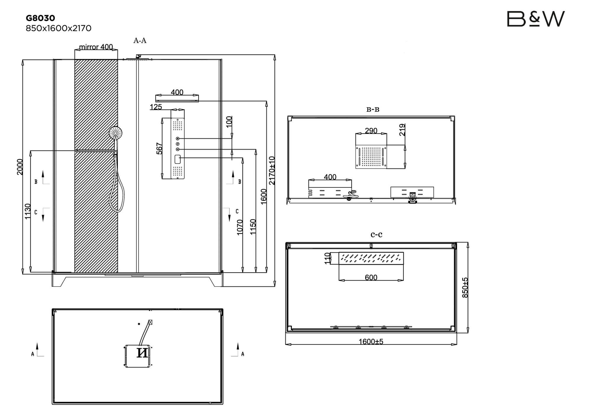 Анодированный алюминиевый профиль Черный матовый Цвет поддона/Высота поддона Белый, 150 мм. Реверсивная модель + Двери Раздвижные, 6 мм. Боковые стекла 5 мм. Задние стекла 5 мм. Крыша 5 мм. Зеркало, интегрированное в стекло 400х2000 мм. Гидромассажные форсунки / панель 567х125 мм. Тропический душ 290х219 мм. Ручной душ 1 режим Душевой шланг с защитой от перекручивания + Электронная панель управления - Кнопочное переключение функций + Bluetooth, радио FM, вентиляция - Верхняя LED подсветка (цвет) - Полка для душевых принадлежностей 2 шт. Быстрая сборка без силикона +Внимание! Для корректной работы изделия на подводки к смесителю необходима установка обратных клапанов (не входят в комплект поставки).