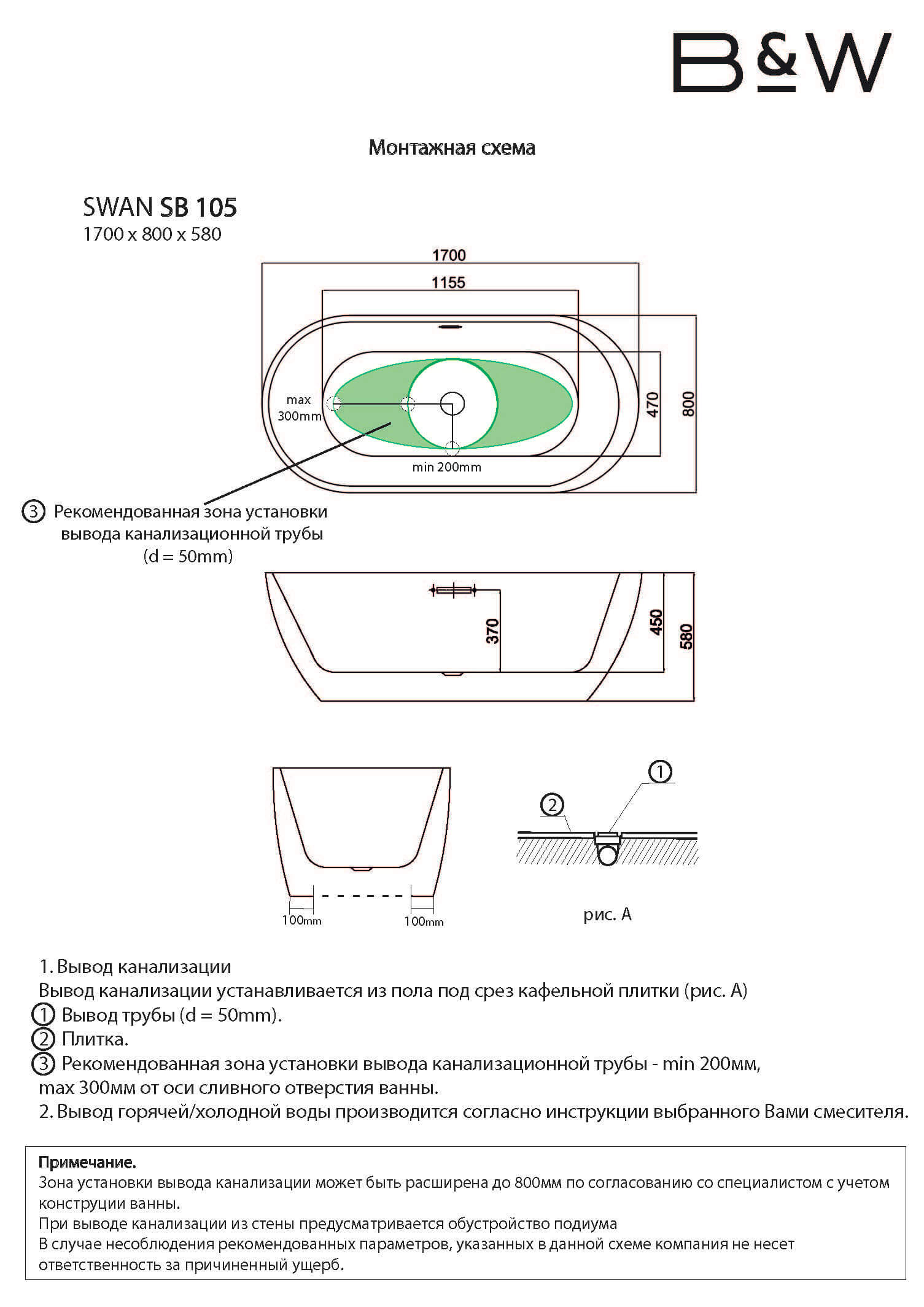 Отдельностоящая ванна компании Black&White в размере 170x80 см. Плавные формы изделия гармонично впишутся в концепцию современной ванной комнаты. При изготовлении использовался 100% акрил компании Lucite,он не меняет цвет , а также дополнительно армирован стекловолокном для стабилизации ванны под нагрузкой. Изголовье расширенно относительно противоположного борта, а спинка имеет анатомический наклон. Ванна оснащена сливом – переливом с донным клапаном в цвете хром. Основание представлено каркасом из нержавеющей стали на ножках регулируемых по высоте. SB 105– продукт с продуманной эргономикой в универсальном стиле.
