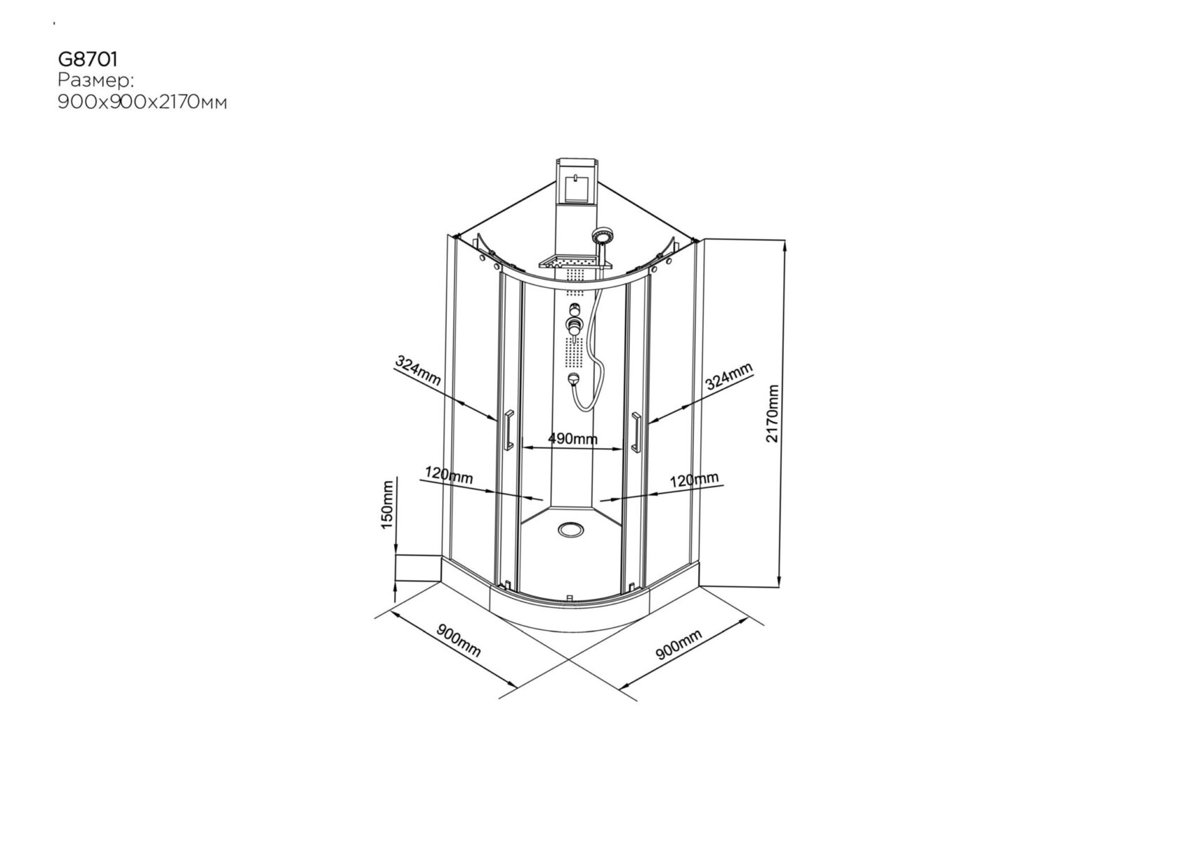 Верхний тропический душ. Ручной душ с черным шлангом. Закаленное стекло 6 мм. Черный матовый профиль. Раздвижной тип дверей. Поддон в белом цвете 150 мм. Усиленный гладкий шланг лейки. Надежные стальные ручки. Полка для душевых принадлежностей. Зеркало по высоте кабины.Размер: 900 х 900 х 2200 мм