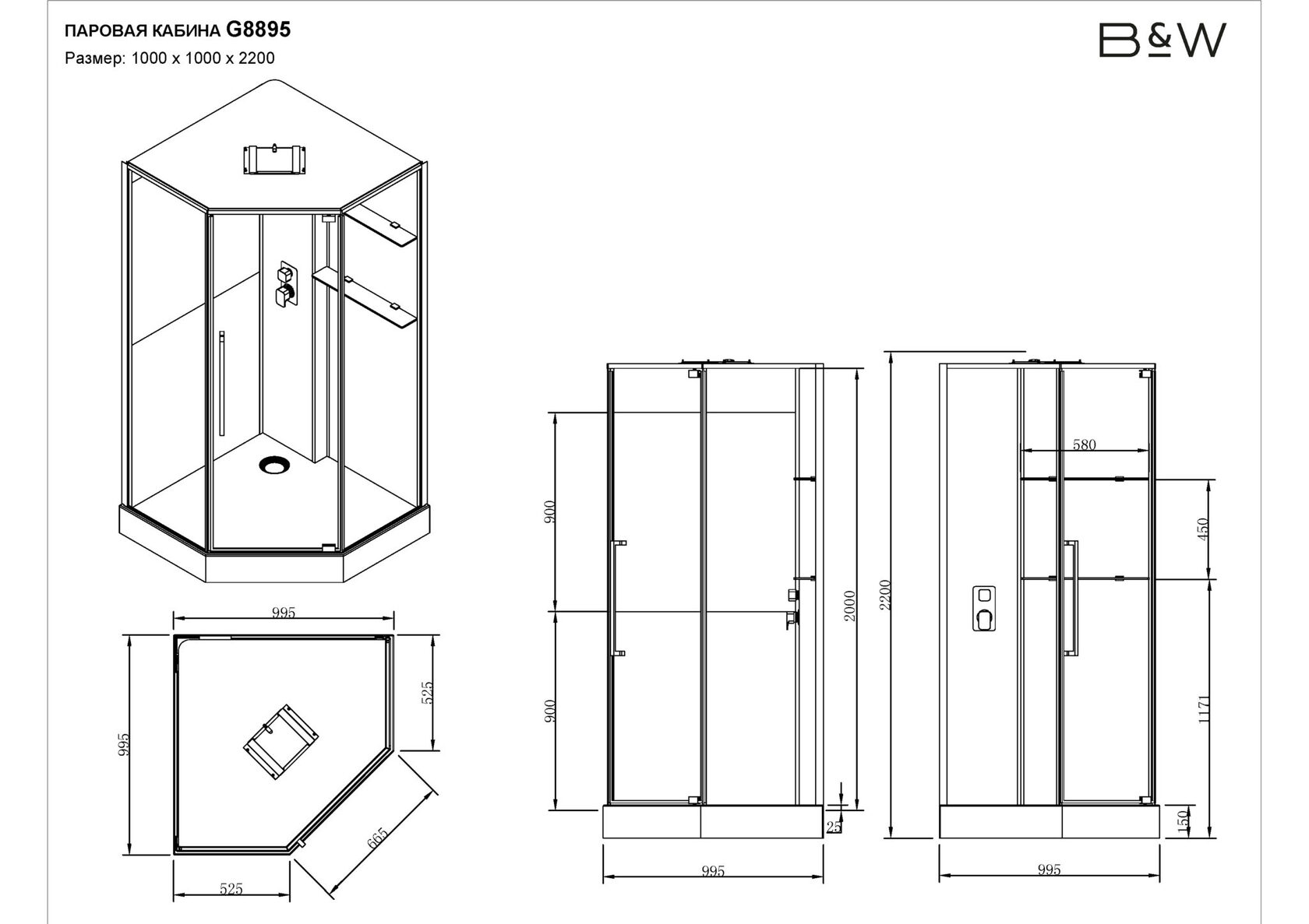 Паровая душевая кабина от Black&White в пентагональном исполнении, размер 100x100 см. Пятиугольная конструкция позволяет разместить изделие в небольшом помещении с незначительными потерями свободного пространства душевой зоны. Цветовое решение с прозрачными стеклами и хромированным матовым профилем отлично подходят в современные интерьеры. Вход реализован с помощью распашной двери . Функциональная составляющая представлена парогенератором, с максимальной температурой пара 60 градусов , управление осуществляется через сенсорную панель. Также доступно освещение, FM-радио и Bluetooth,вентиляция и тревожная кнопка. На потолке установлен верхний душ с силиконовыми форсунками , ручной душ режимный, на шланге установлена защита от перекручивания. Для размещения душевых принадлежностей предусмотрены два полочки из алюминия в цвете профиля.В левую заднюю стенку интегрировано зеркало.