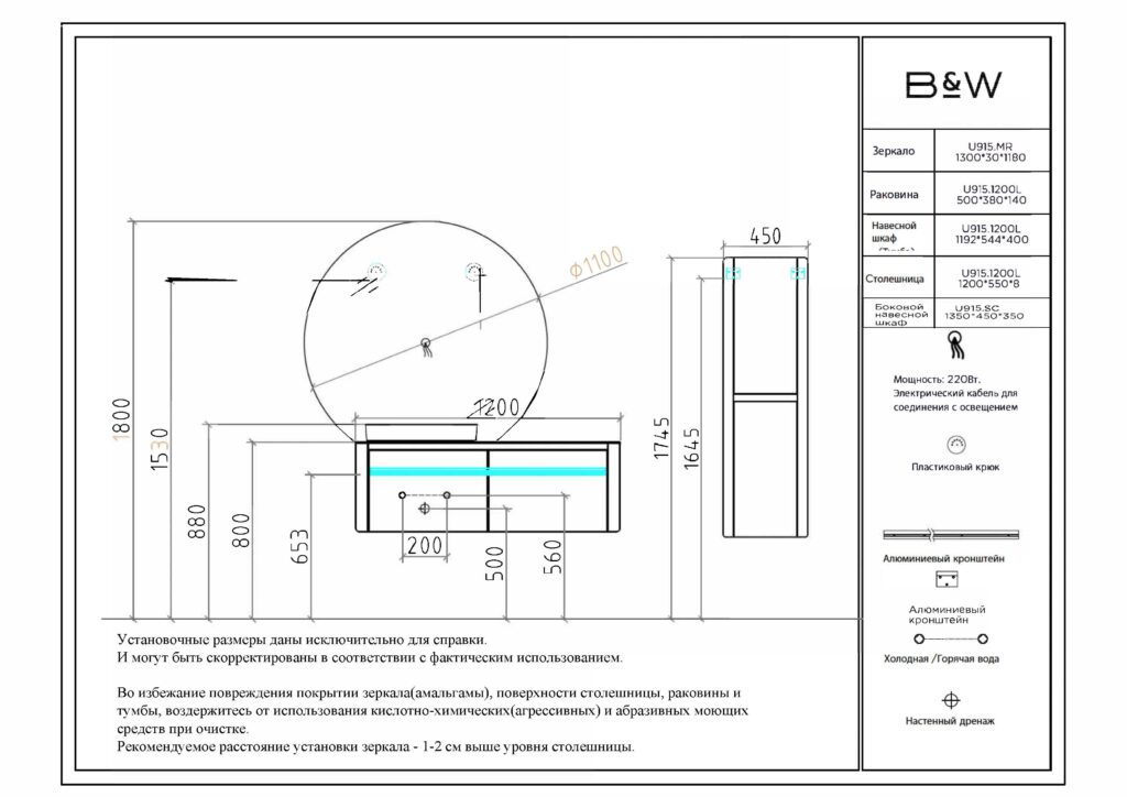 Тумба с раковиной Black & White U915 1200LСкандинавский дух и утончённость в большой подвесной тумбеОписаниеТумба U915 1200L от бренда Black & White — это мебель, которая сочетает лаконичность, скандинавский стиль и функциональность. Столешница из сверхтонкого керамогранита, стилизованного под натуральный мрамор, с изящными прожилками — эффектный акцент, который привлекает внимание. Полувстраиваемая белая раковина из сантехнического фарфора с низкими бортами позволяет установить смеситель любой высоты, делая интерьер гибким к стилю и удобству. База из влагостойкого МДФ, покрытая эмалью светло серого цвета, подчёркивает чистоту линий, а система выдвижных ящиков Blum Slim обеспечивает надёжность и удобство в повседневном использовании.
