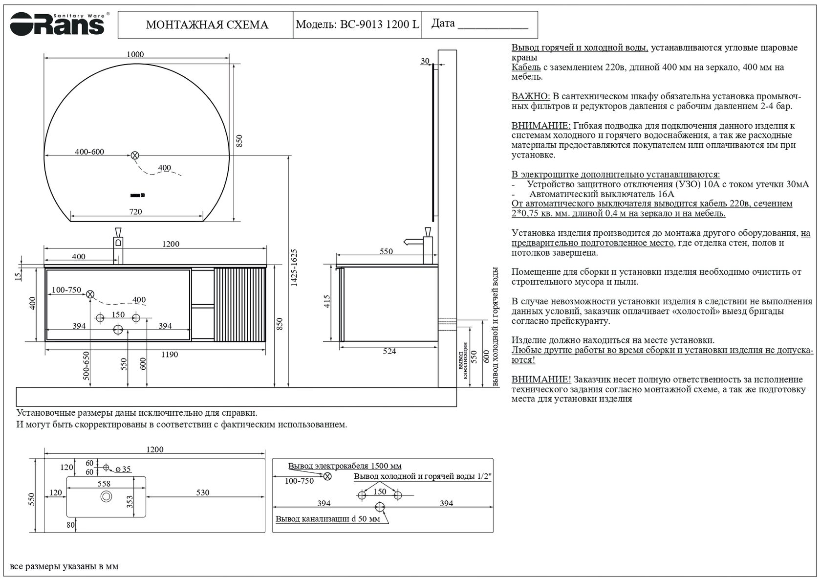 Тумба с раковиной Orans BC-9013-1200LПодвесная тумба с раковиной для ванной комнатыОписаниеТумба с раковиной Orans BC-9013-1200L — это элегантное и функциональное решение для вашей ванной комнаты. Подвесная конструкция придаёт лёгкость и современный вид, а также облегчает уборку. Раковина выполнена из искусственного камня белого цвета с фактурной поверхностью, что придаёт ей современный и стильный вид. Столешница выполнена из того же материала, создавая гармоничный и целостный образ. Тумба изготовлена из влагостойкой фанеры, окрашенной в матовый синий цвет, что обеспечивает долговечность и устойчивость к влаге. Зона хранения включает один выдвижной ящик с акриловым фасадом, одну распашную дверцу и две открытые полки, предоставляя достаточно места для хранения косметики, полотенец и других принадлежностей. Дополнительно тумба оснащена LED подсветкой фасада и боковых стенок ящика с датчиком движения, который автоматически включает подсветку при приближении.
