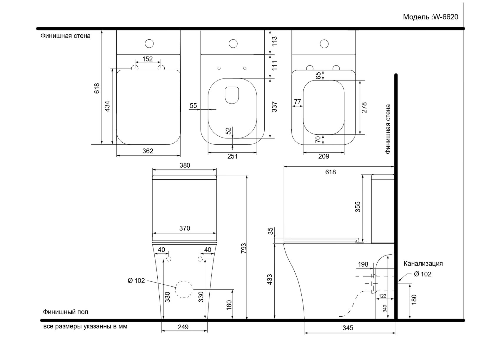 Black & White W-6620 устанавливается стационарно на пол, без необходимости скрытой инсталляции. Подключение к канализации выполняется стандартным способом, а удобные точки крепления упрощают монтаж. Для сохранения чистоты и эстетики поверхности рекомендуется использовать мягкие и неабразивные чистящие средства.